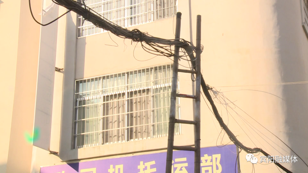 11月2日,记者来到现场看到,在县城农科路33号居民楼与38号居民楼之间有一捆下坠的缆线横穿而过,中间仅用一把竹梯支撑,并不牢固。下坠的缆线距离路面有3米高,小车和电车能正常通行,但大货车通行有一定的困难。
